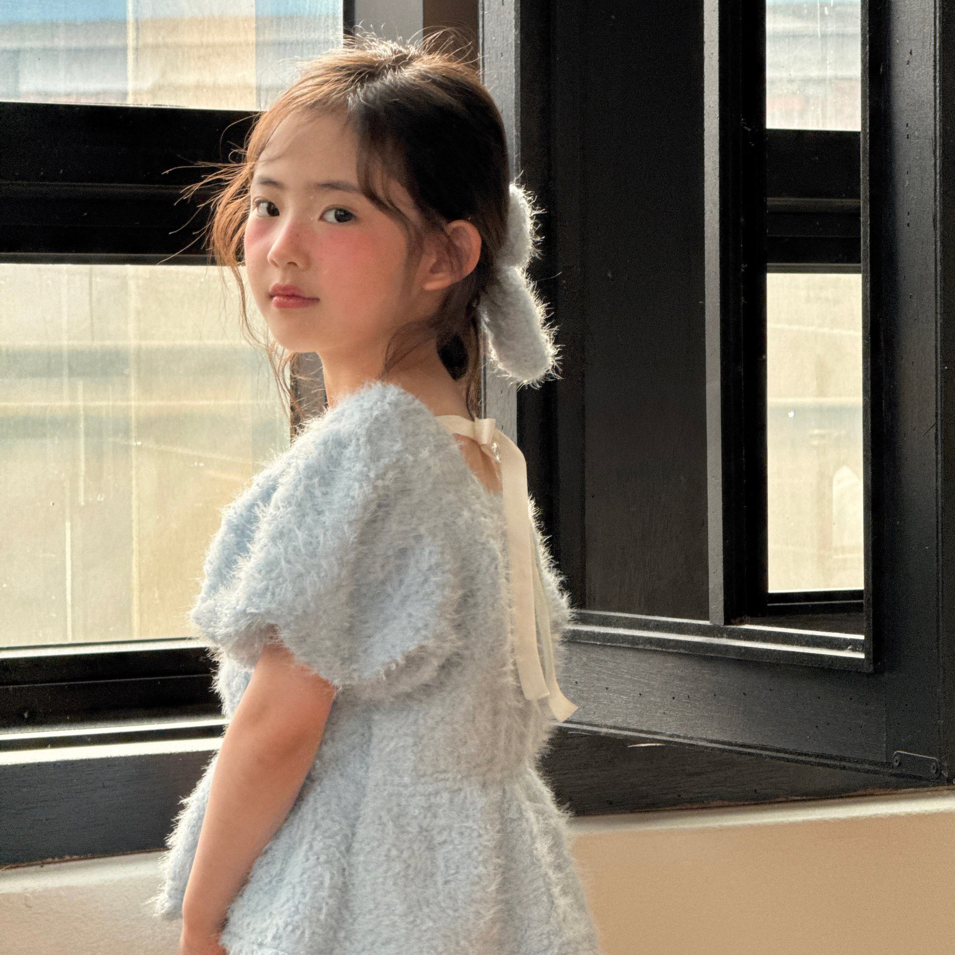 Hearty embroidered dress in fluffy, voluminous fabric with puff sleeves, shirred waist, and flared hem. Ribbon back detail completes a sweet look, perfect layered over a tee.